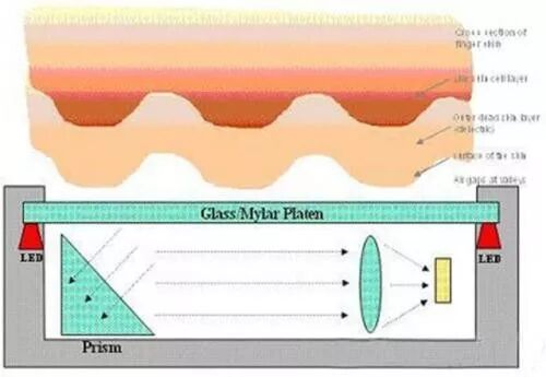 光学识别是应用比较早的一种指纹识别技术,比如之前很多的考勤机、门禁都采用的就是光学指纹识别技术。 主要是利用光的折摄和反射原理,将手指放在光学镜片上,手指在内置光源照射下,光从底部射向三棱镜,并经棱镜射出,射出的光线在手指表面指纹凹凸不平的线纹上折射的角度及反射回去的光线明暗就会不一样。